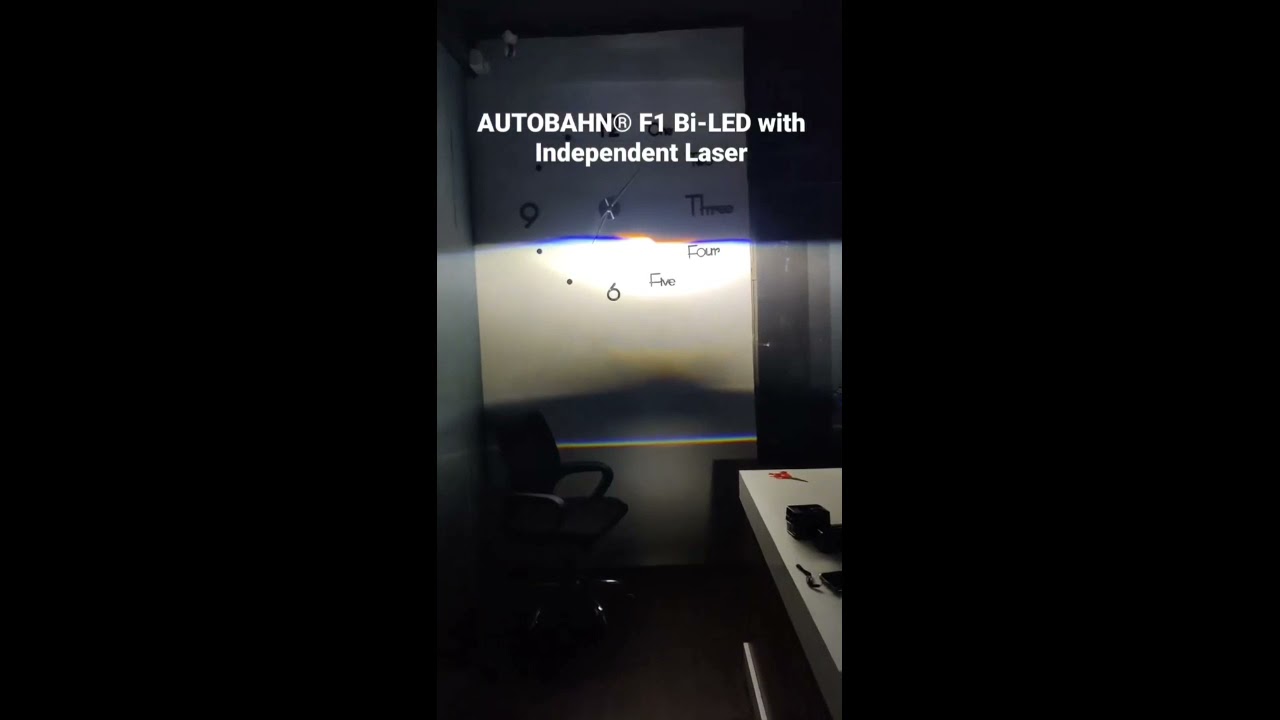 8) Beam Pattern: Strong cutoff low beam with independent high beam. Also Independent laser beam thorugh laser tube. Autobahn Bi LED Laser Projector
